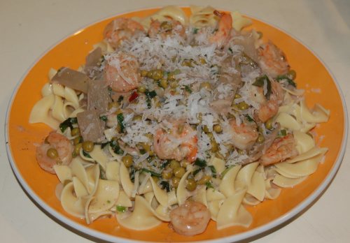 Step 4: Put It All Together – Put egg noodles in plate and pour Shrimp and Vegetable mixture over it. Sprinkle some shredded coconut on top and enjoy!