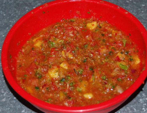 Step 3: Put it all together – Pour your concoction from step 2 in with your diced fruits and vegetables from step one and thoroughly stir together with a spoon. Serve over whatever you wish to enjoy it with.