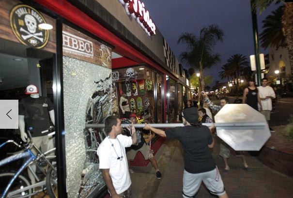 Sadly the most excitement of the entire US Open happened after the whole kit and caboodle was over Sunday evening on the 29th of July. Apparently a bunch of idiots decided to trash Main Street Huntington Beach in a post surf contest riot the likes of which has not been seen since the US Open of 1986 at the same venue. Although not nearly as severe as the ’86 riot damage was done, 8 people were arrested, police injured. I for one was outraged when I heard the news this morning as I was trying to enjoy my breakfast.