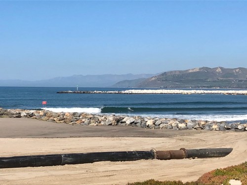 There was some new swell on the buoy this morning. Once again we were fighting a 5 ft high tide at 11:30. I decided to head out early to get the incoming push and off shores. As always when I make an attempt at surfing early everything goes against me. All was looking good till I got to about Faria Beach on the 101 where traffic was nearly at a stand still. As it turns out there was a gnarly truck accident earlier in the morning causing the two right lanes to be closed for clean up. Whatever happened it must have been gnarly cause they had a crane loading up pieces of the truck onto the bed of another truck when I was passing by around one. I lost an hour to this traffic debacle. I got to the Harbor and it was rather busy with cars parked everywhere. When I came over the dunes there were mixed peaks from River to Knoll with about thirty guys spread out among them. The largest concentration at the Knoll. New Jetty had about six guys on it, though it looked pretty walled and there were a handful of guys trying there luck on the Bounce at South Jetty. The wind was off shore and there were some solid head high plus sets and the occasional walled out clean up set. It was pretty inconsistent and looked hit or miss. That plus the crowd I decided to give a Strand a look. It was way too high and way smaller for it to be good there. Back to the Harbor I went, by this time the wind had veered south to my utter disappointment. Left with no other options I paddled a peak just north of the River Mouth and had a torn up left to myself. Everyone bailed as soon as the wind came up. There were some really decent lefts coming through, but between a very strong rip and a south drift coupled with big clean up sets and no one being out holding position was tough. I ended up having to paddle pretty much the entire session to be even remotely close to being in the right spot. More times then not I found myself in the wrong spot and was only able to capitalize on one out of three sets that came in. On my last wave I almost broke my board and my neck boosting a close out section that rolled onto the dry sand. Lucky both of us came out unscathed and on that note I decided to call it a day.