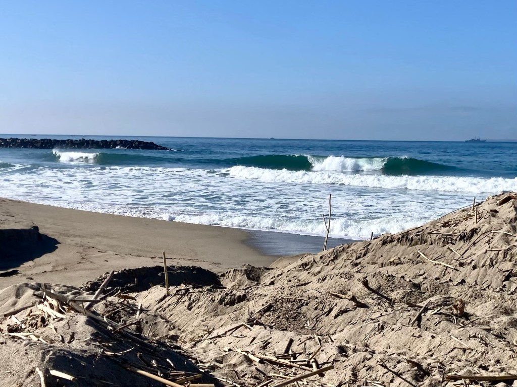 Today was really frustrating. I was tempted to drive up to Rincon. I have been in a bit of a point break withdrawal so to speak only surfing Strand all week. I got word there were waves at ‘Con but the wind was south on it and swell a bit broken up. I saw a few kill-able lines at the Ship and had a feeling it was going to turn on. I called CC and Bizarro to show up. Of course as soon as I put my suit on and walked up the beach the wind went stiff WSW adding lots of bump and crumble on what ten minutes ago was really fun surf. By the time CC and Bizarro showed up it was completely trashed. If Biz comes to film I’ll at least try and hammer down a handful of clips before leaving. Despite the horrible conditions I managed at least three A clips and a handful of B clips. Keepers are keepers no matter how terrible the waves. I suppose it worked out cause I was back home by noon to get on my ding cue. Don’t let this photo fool you it blew out and got trashed before I even got my toes wet.