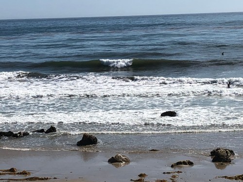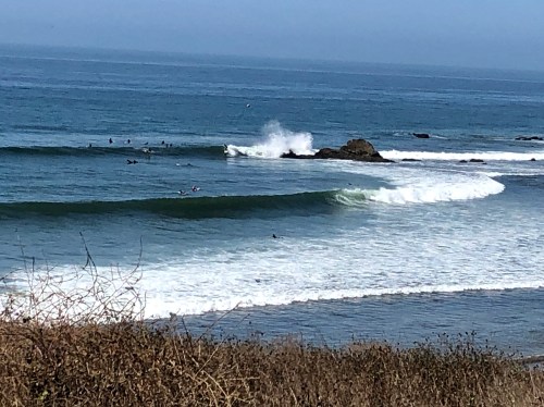 Courtesy of the fog, the small swell and being on vacation we had a lazy morning in bed. In our busy every day lives this is a real luxury. On the the hunt the first stop was Willow Creek, where there was definitely more wind swell showing then yesterday. It was borderline surf-able or not. I decided it was still just a bit too inconsistent and close to the rocks to be worth a paddle. Pacific Valley had what appeared to be from the road a fun looking wedgey left. It was rather disorganized and many were dumping, classic my kind of conditions. The spot itself is a rather nice place to hang out as well. I paddled and it was about as fun as it looked. I didn’t really get anything phenomenal, but managed a few boosts off the close out bowl. My lady and I hung around the beach there for a little bit before heading home. On the way back we stopped in Cambria for a repast. We were too early for dinner at this spot right on Moonstone Beach appropriately called the Moonstone Bar & Grill. We took a walk to kill sometime and got right in the eye shot of retrieval effort of an ocean kayak whose owner it appeared must have fallen in while fishing. Dinner was once again another calamity of mediocre California Sea Food cuisine. At the very least the service was decent and the view/atmosphere satisfactory. I will definitely not be eating at the Moonstone Bar and Grill again. The food is not worth the money. From there it was a rather uneventful drive home to Santa Barbara. marking a rather fun early week getaway.