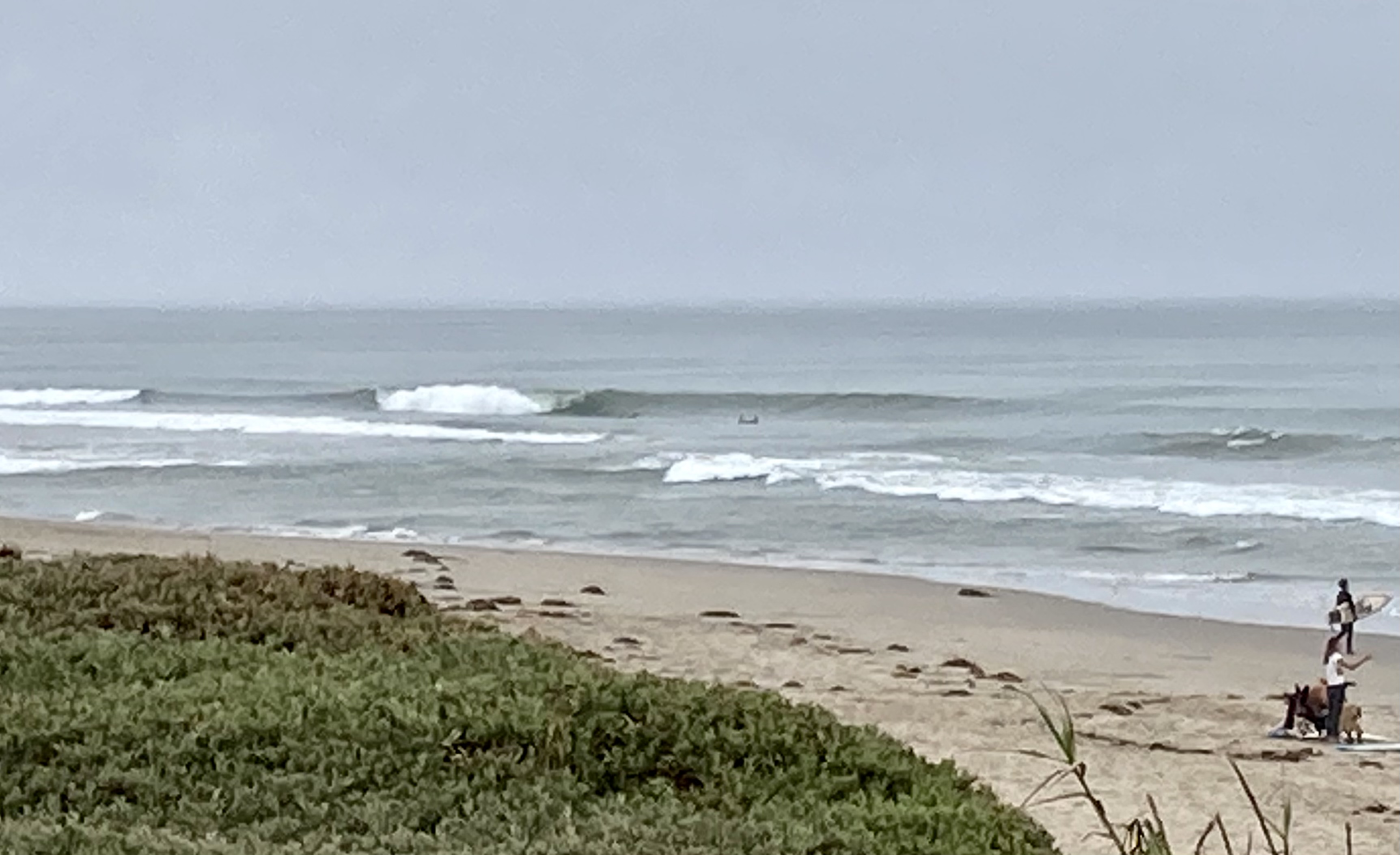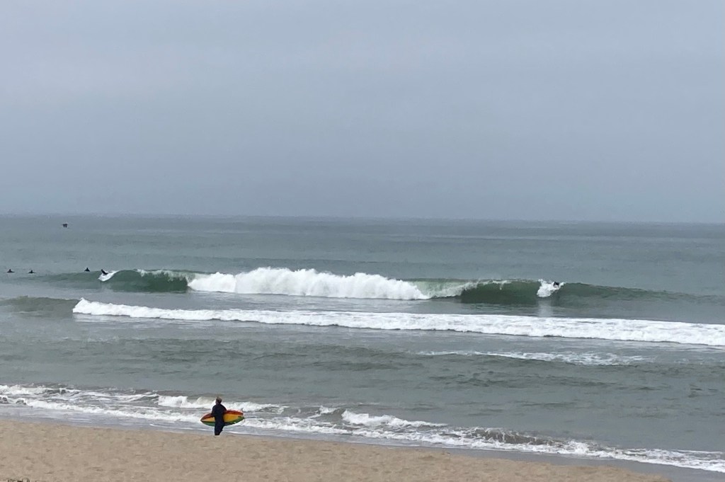 Instead of the wind blowing NW today it was blowing south west. There was a slight up tick in the wind swell though the points and Strand were still small. I saw a few rip-able nuggets at Emma and paddled. I was still feeling rather beat out there though not quite as bad as yesterday. There were only two other guys out and some fun peaks. Then a pack of five kooky kids paddled followed by three body boarders and the line up was clogged. I spent the rest of my session negotiating people constantly in my way when riding and paddling for waves. The water was very warm, maybe in the low 60’s and the air was hot. I found myself uncomfortably too warm out there for the first time since fall. The rest of my day was spent at the Post Office.