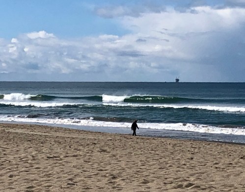 I really wanted to get a surf in today. With restrictions getting heavier everyday in this once free zone we call the United States now bordering on a totalitarian state one can never know when he will wake up and find that he is no longer able to even legally leave his home. The buoys were still small with just a touch more south in the water. The Lower’s cam looked solid and usually if that is the case there will be something at Ventura Harbor. All it contained was crowded close outs up and down the beach with the exception of the one River Bar, which was packed and barely offered one wave every fifteen minutes. All the New Jetty peaks were tiny and over crowded also. I had a hail Mary look at Shores, which was too high just as I suspected and the wind came up stiff south. At that point I started the trail of tears home checking every out post form Emma to Johns all just a tad too small and whatever would have been worth a grovel was blown to smithereens by the south wind. Still wanted to get a bit of exercise my lady and I decided to walk the beach from Father Johns to Hobsons at a steady pace. This was close to a four mile round trip. I found a few pieces of sea glass and we saw some cool shore birds. The rest of the day, like the rest of you was spent home. And the beat goes on. Don’t worry I didn’t interact with anyone but my fiance, whom I live with. Any one we saw we stayed the regulatory six feet from. Please don’t shame me.